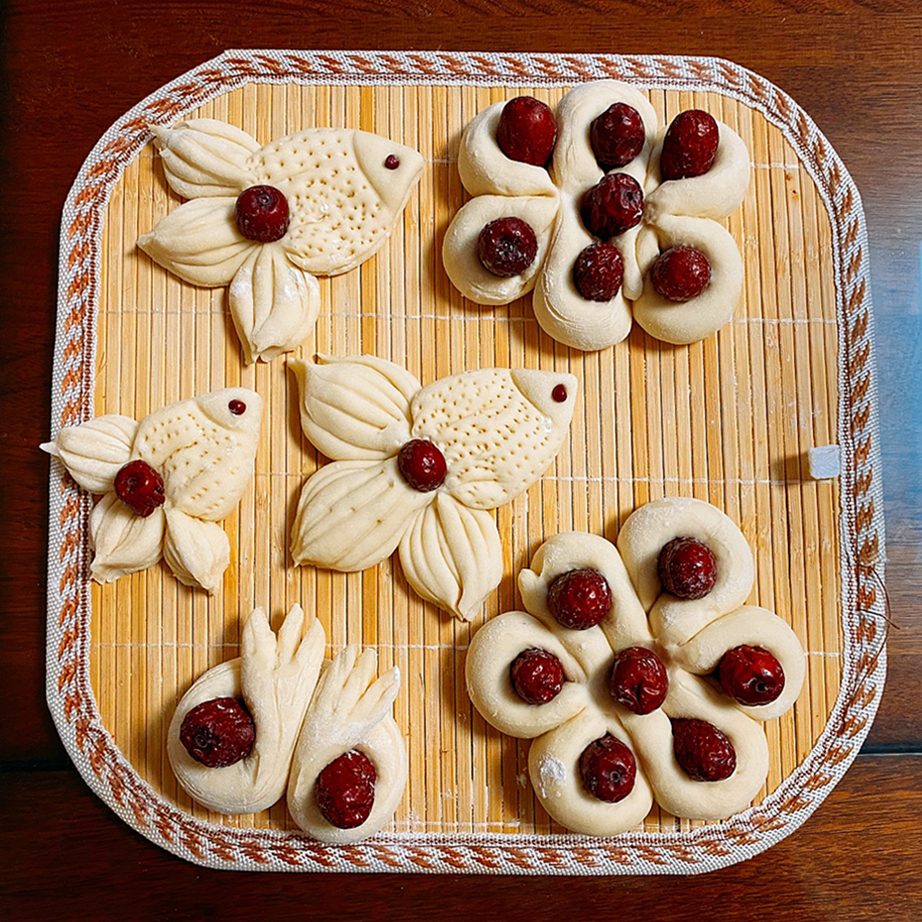栩栩如生的人物形象、花卉果实、飞禽走兽……造型多种多样的花馍,如同一个个民俗工艺品,令人目不暇接、流连忘返,也寄托着百姓对美好生活的向往。“登高”象征步步登高、事业兴旺;“枣花”象征心灵手巧;“鱼”表示“年年有余、如鱼得水”;“花”则有“花开富贵,如花似玉”之意……
