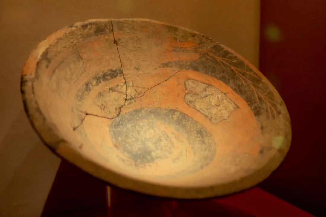 彩绘蟠龙纹陶盘,陶寺遗址核心文物之一。陶寺一共出土四件龙盘。盘曲如蛇,身体上见有鳞状斑纹,口衔枝状物。陶寺龙纹为探索中华民族龙图腾的起源提供了重要线索。