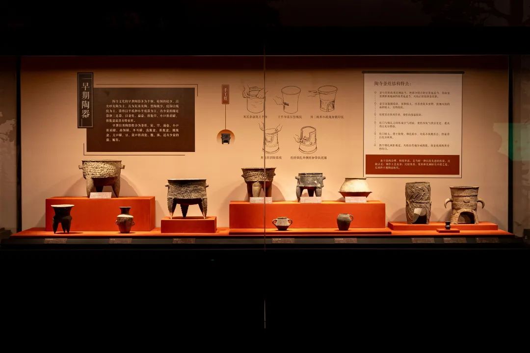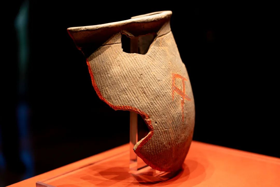 朱书扁壶(展厅中为复制品,真品现藏于中国考古博物馆)。扁壶为泥质灰陶,器表饰细条竖蓝纹,是陶寺先民打水的工具。这件破碎的扁壶有朱书文字位于两面,十分珍贵。