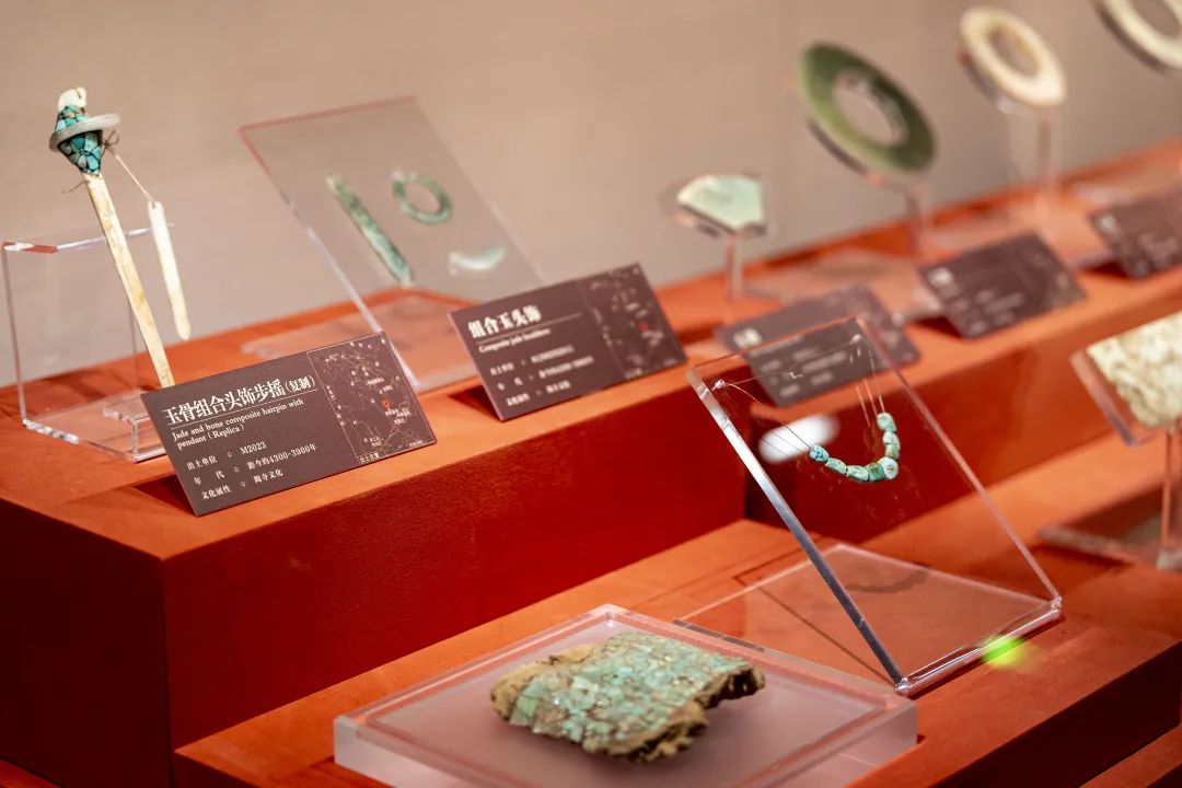 陶寺遗址出土的绿松石镶嵌腕饰(左下)等礼器。