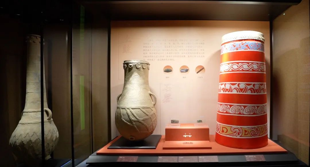 陶寺遗址出土的土鼓(展厅中为复制品)与鼍鼓(复原)。