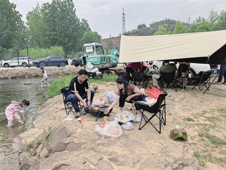 赶上假期,来了很多人。河边平坦处,支起了一顶顶帐篷。“妈妈,快点把咱们的‘房子’盖起来。”孙洁与朋友撑起多功能天幕帐篷,孩子们早已迫不及待,帮着搬来折叠座椅,摆上提前准备好的水果、零食、饮料。忙完,大人们坐在帐篷里,休息聊天,好不惬意。外面,孩子们在小河边上踩水、捞鱼,玩得不亦乐乎。