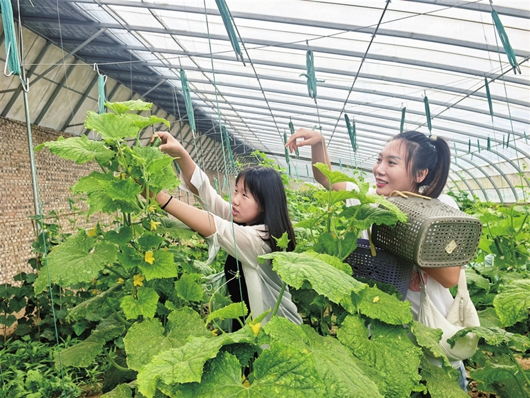 母女俩拎着小筐子,穿梭其间,随摘随吃,体验动手采摘的乐趣。大棚里,还有鲜嫩的黄瓜、蘑菇、无花果,任人挑选。高小梅说:“趁着放假,带娃进村吃顿农家饭,体验采摘乐趣,很有意义。”