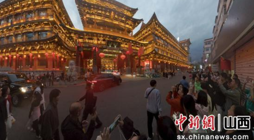 山西饭店作为百年老字号,凭借其雕梁画栋的古建风貌和夜间璀璨的灯光装饰,在国庆期间成为社交平台上的热门打卡地。华灯初上时,饭店周围“水泄不通”,游客纷纷拍照分享其气派典雅的门楼与融合传统美学的光影景观。