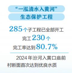 与此同时,我省牢记习近平总书记寄予山西“一泓清水入黄河”的殷切期盼,2023年6月,启动了“一泓清水入黄河”生态保护工程,计划用三年时间,对黄河的第二大支流——汾河,进行全流域、全方位治理。“一泓清水入黄河”生态保护工程在聚焦水质改善目标的基础上,衔接水网建设、防洪能力提升、黑臭水体治理等多种类型,通过上下游、干支流、左右岸、水陆域一体谋划,治污、调水、清淤、增湿、绿岸一体实施,取得了初步的生态效益、社会效益、经济效益。如今,285个子工程已完工230个、完工率达到80.7%。