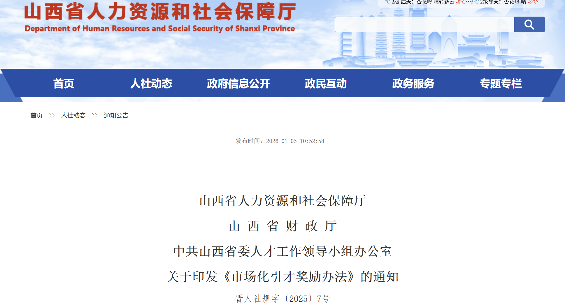 近日,山西省人力资源和社会保障厅、山西省财政厅、中共山西省委人才工作领导小组办公室联合印发《市场化引才奖励办法》(以下简称《办法》),旨在进一步推动全省猎头机构发展,完善通过猎头机构开展市场化引才机制,发挥市场配置人才资源作用。《办法》自2026年1月31日起施行,有效期三年。