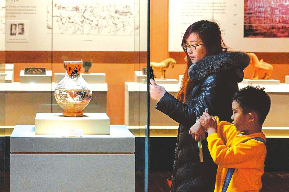 游客在展厅内拍摄汉代彩绘陶壶。山西博物院供图
