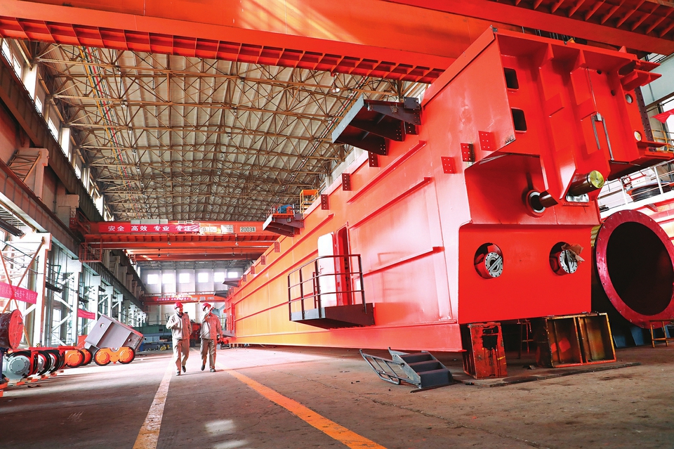 太重集团起重机分公司车间,即将发往印度AMNS公司的450t铸造起重机正在进行拆车包装作业。武剑峰摄