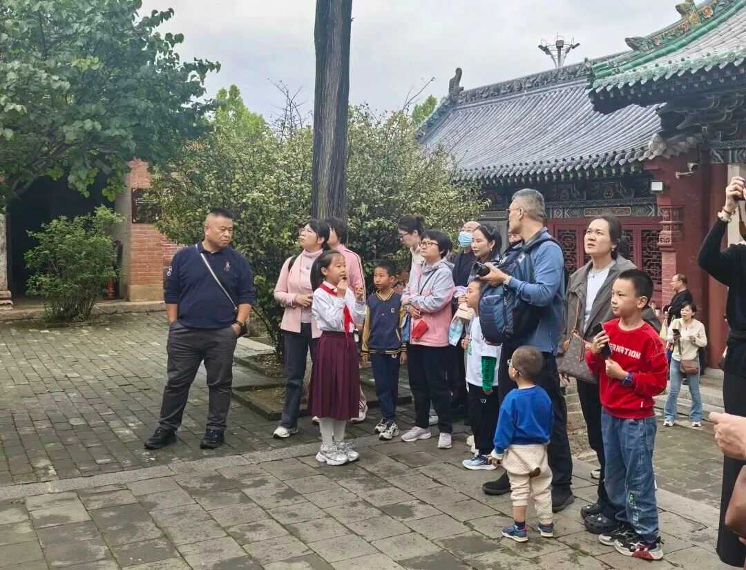 “大家好,欢迎来到玉皇庙……”10月1日,孩子们各自领着一群游客穿行在景区内,用稚嫩的声音为游客导览。从整体布局到主要建筑,从二十八星宿到道教文化,孩子们娓娓道来,将玉皇庙的历史价值和艺术价值生动地展现出来,吸引了每一位游客驻足聆听。