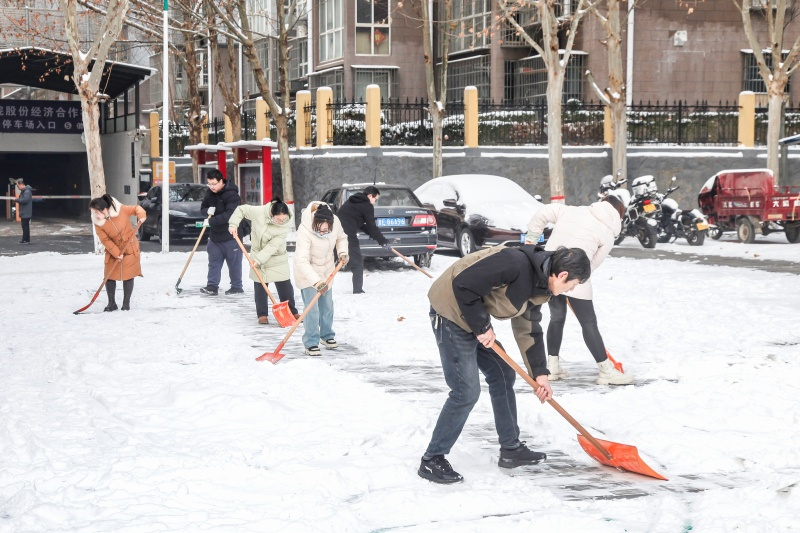 在前书院社区,工作人员与志愿者手持铁锹、扫帚等工具,分组对小区主干道、社区广场及楼间巷道的积雪暗冰进行全面清理,确保道路畅通和居民出行安全。