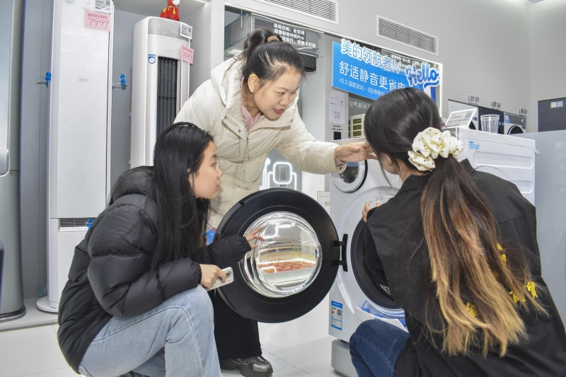 活动现场人头攒动,气氛热烈,多元体验区为市民打造出了“年味+实惠”的沉浸式消费场景。全套智能家电展示区内,洗衣机、空调、厨房电器等各类产品整齐陈列,科技感十足。工作人员耐心细致地为每一位咨询的消费者讲解产品功能、能效等级、以旧换新流程及补贴政策,帮助消费者轻松选购。