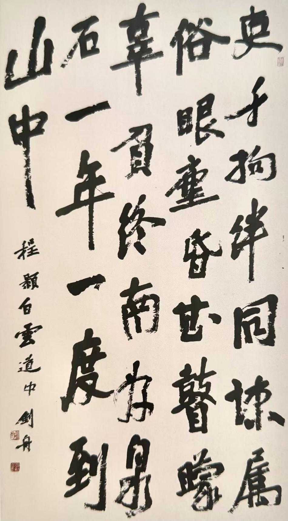 张剑舟,中国书法家协会会员,山西省书法家协会理事兼楷书委员会委员,晋城市美术家协会副主席。此作品为张剑舟的行书作品《白云道中》。