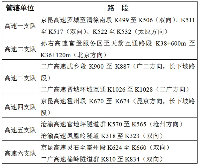 2、2022年9月30日开始,太长高速辖区主线禁止途经榆岭隧道群路段(榆社北至太谷东站之间)的大件运输车辆通行。