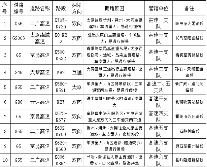 ★G55二广高速太长段:春节节假日期间(1月28日0点至2月4日24点)太原、榆次、太谷东、榆社北、榆社南、武乡、王村、襄垣、屯留、长治西收费站入口禁止危化品车和超限车上高速;襄垣、屯留、长治西收费站超限车可以上高速。