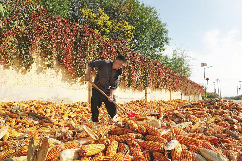 10月14日,原平市新原街道桃园村,村民紧抓晴好天气晾晒玉米。褚震摄