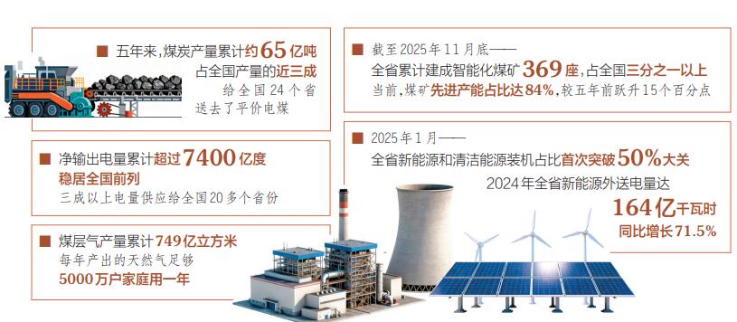 稳产保供有力有效。“十四五”期间,全省新增产能1.5亿吨/年,日均产量稳定在350万吨以上,累计生产原煤约65亿吨,占全国总产量的近三成;以长协价为24个省份保供电煤20亿吨以上,有力保障了国家经济社会发展用能需要。