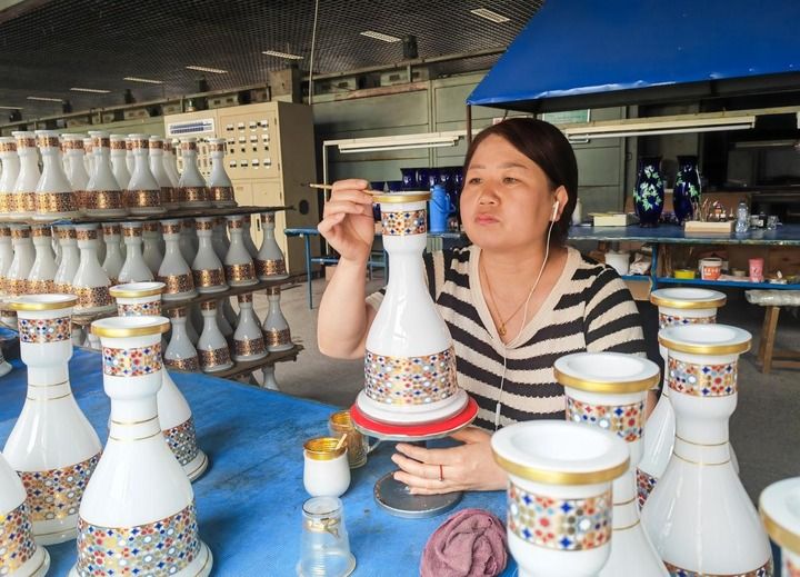 时值盛夏,尽管天气炎热,但工人们仍在加紧赶制订单。在生产车间里,工人吹泡、开模、整形……每道工序都紧密衔接,女工们则用泥状玻璃粉在嘉华杯上绘制白色花朵。十几道工序后,她们开始用真金溶制的黄金水在上面勾画各种华丽线条。这是一批总量130多万只玻璃杯的订单,能装七八个集装箱,很快就将用货轮运往沙特阿拉伯。