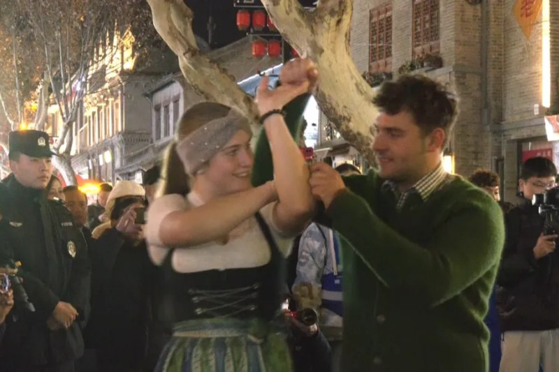 10名来自奥地利克拉根福市青年艺术团的演员们身着特色服饰表演了奥地利传统民族舞蹈,晋城市的演员们也带来了《跟着悟空游山西》等民族演奏。整个现场彰显了多元文化交融的魅力,吸引了许多市民驻足停留,拍照留念。