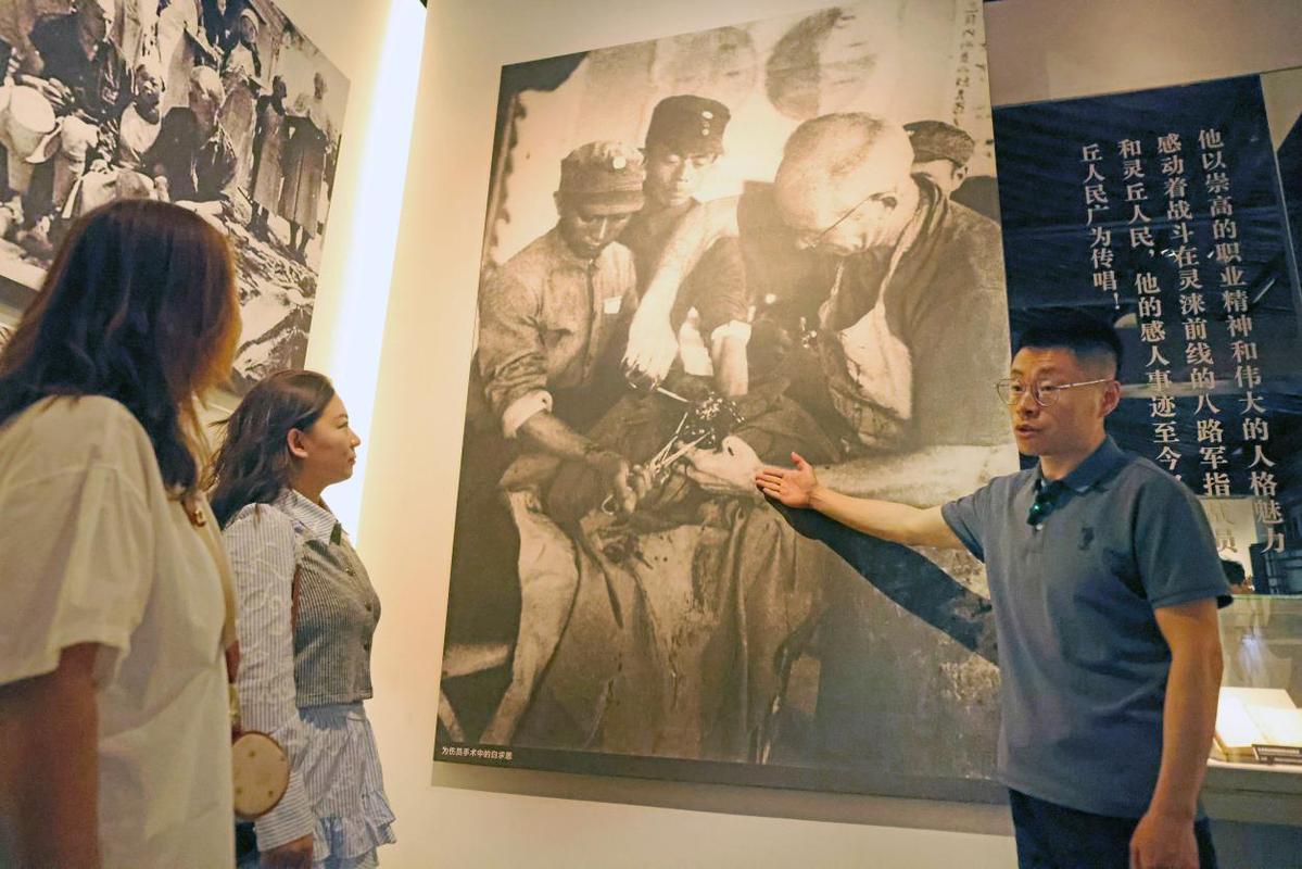 5月13日,大同红色记忆馆负责人任冬(右)给游客讲解白求恩在山西灵丘抗日前线为伤员做手术。 朱兴鑫 摄