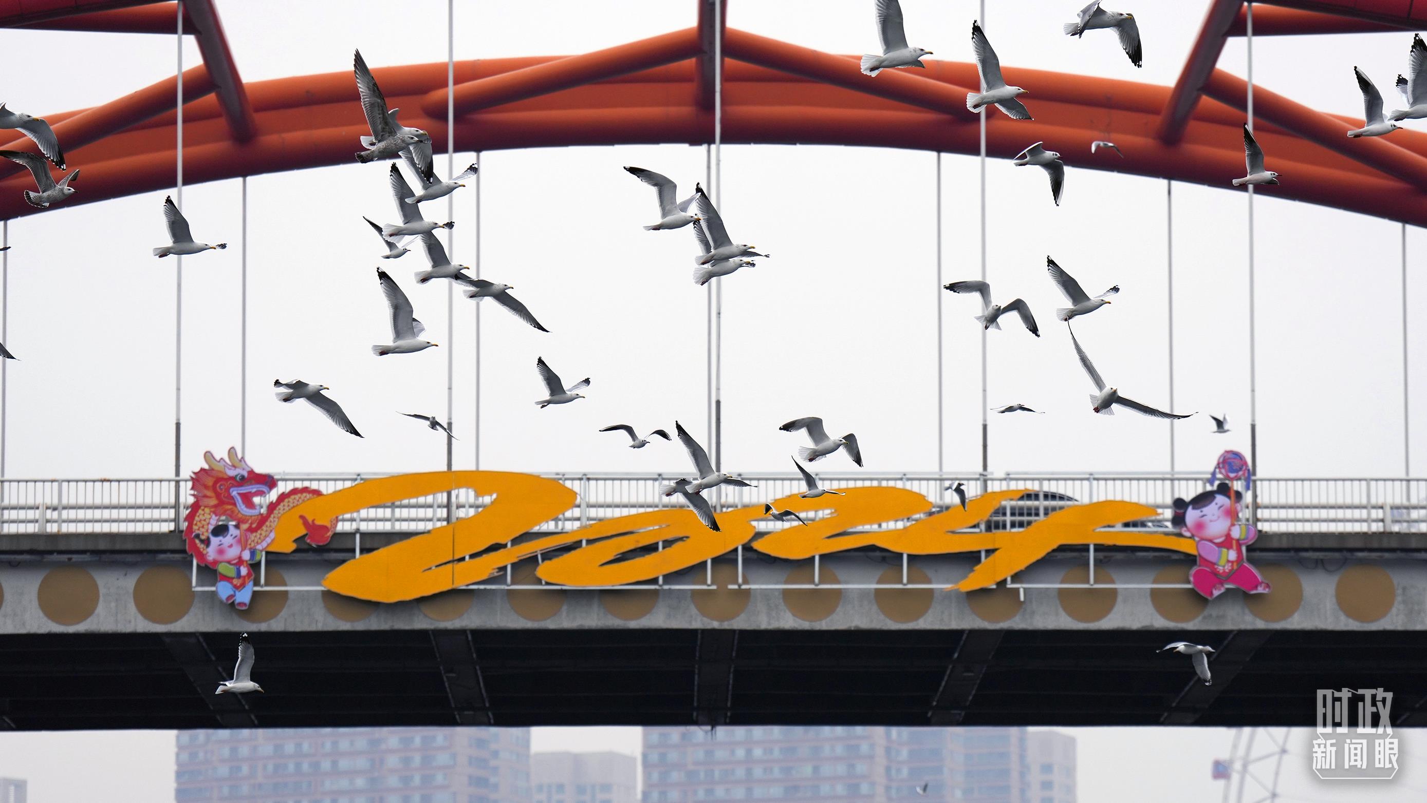 △天津金刚桥,成群的海鸥飞越海河。(总台国广记者李晋拍摄)