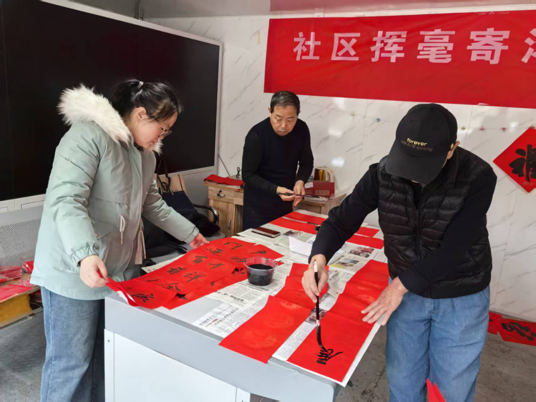 现场气氛热烈,居民们纷纷驻足欣赏,不时为精湛的书法赞叹。不少人更是亲手尝试,虽笔触生涩,却满含对新春的期盼。老人们细心挑选合意的对联,邻里之间交流心得、互道祝福,欢笑声与墨香交织,勾勒出一幅和谐温暖的社区画卷。