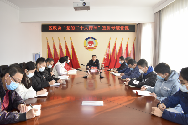 申军生要求,政协机关全体人员要把深入学习好、领会好、贯彻落实好党的二十大精神作为当前和今后一个时期的首要政治任务,始终心怀“国之大者”、立足“区之大事”,紧紧围绕新时代全区发展新机遇、新使命、新要求,知责于心、担责于身、履责于行,努力在新征程上书写政协履职新答卷。要坚决做到以赤诚之心高举旗帜、紧跟党走,做“两个确立”“两个维护”的拥护者;以务实之功助力发展、促进民生,做“聚焦中心”“凝聚共识”的践行者;以昂扬之姿勇于担当、善于作为,做“躬耕本职”“踔厉奋发”的耕耘者。要加强党的全面领导、提高建言资政水平、增强凝聚共识本领、抓好委员队伍建设,把发展全过程人民民主的要求落实到政协工作的方方面面,在发展全过程人民民主中展现政协担当作为,为全面建设社会主义现代化国家凝聚智慧和力量。(李志斌 王媛媛)